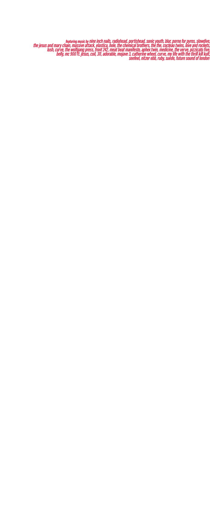 ■ナイン・インチ・ネイルズ“Heresy” ■スロウダイヴ“Alison”/“Blue Skied an ‘Clear” ■ラヴ・アンド・ロケッツ“This Heaven” ■ジーザス&メリー・チェイン“Penetration”/ “Sometimes Always” ■ピチカート・ファイヴ “Groovy Is My Name” ■コクトー・ツインズ“Summer-Blink” ■エイフェックス・ツイン“On” ■ラッシュ“Undertow (Spooky Remix)” ■ザ・ヴァーヴ “Already There” ...and more!!